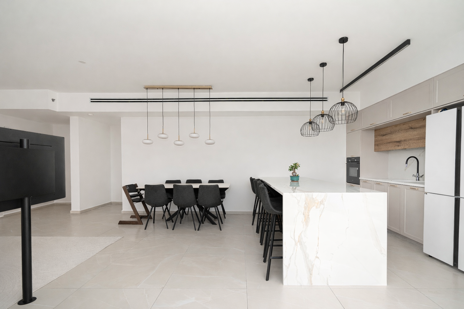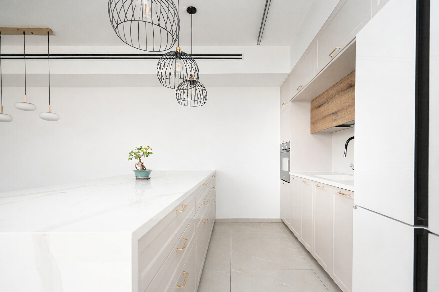 מטבח גדול ומרשים עם אי מרכזי והמון אחסון